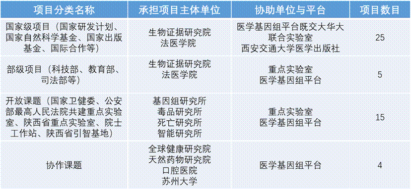 目前承接国家和教育部等政府各类研究项目,例如人类遗传资源保护、利用项目,也是国家人类遗传资源共享服务平台的重要组成部分之一,例如人类基因组计划、中华民族基因组多态现象、水稻基因组计划、朱鹮基因组计划等,例如首批合作、协作、协助的项目《西北区域自然人群队列研究》、《白芷药材全基因组测序》《法医昆虫基因组种类、发育、演替及进化研究》《吸烟对种植体周围微生物群落影响的宏基因组学研究》等在国内外有较高学术影响力。生物证据研究院面向世界科技前沿,面向国家重大需求,以基因组学、生物信息、智能生物证据、法医科学等研究领域,以自然科学和社会科学的交叉研究、综合研究为特色,以获取原始创新理论成果、自主知识产权核心技术与关键设备为主要研究目标,逐步实现国家双一流学科建设和创建世界一流学科的目标,全面推进学科创新体系建设。