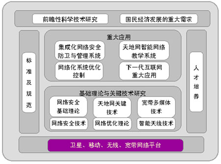 伴随网络经济和网络社会时代的到来,互联网已成为继交通、电力之后的第三大国家基础设施,人类社会正步入一个崭新的知识经济和信息化时代,以卫星、移动通信网络、宽带网络和计算机互联网络构成的立体式网络传输平台,已经成为人们生活、工作、学习、交流的基本平台和工具。 本实验室将选择“智能网络与网络安全的理论、关键技术及其应用”作为主要研究方向。智能网络是下一代互联网的核心研究内容之一,也是未来互联网技术及其应用的主要追求目标,而网络安全技术则已经成为事关国民经济、社会稳定乃至国家安全的全局性和基础性问题。本实验室拟选择以下五个对国家信息基础设施和信息化应用具有重大效益及应用前景的关键理论技术作为主要的研究方向。整体研究框架请参考图1。